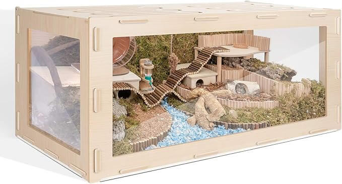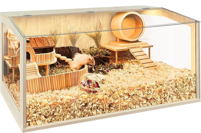 Mainstream media tends to portray these creatures as easy, compact pets that you can keep in a tiny, toy-looking cage. Unfortunately, this is anything but the case. Hamsters require a minimum of 40x20 inches (or 100x50cm) of floor space. This does not include any platforms for climbing since hamsters need more space to run rather than climb as they aren't great climbers. Bigger is ALWAYS better for your hamster (especially females as they are known for being difficult to please). The enclosures below are my top choices! This will include links and prices as well for your convenience